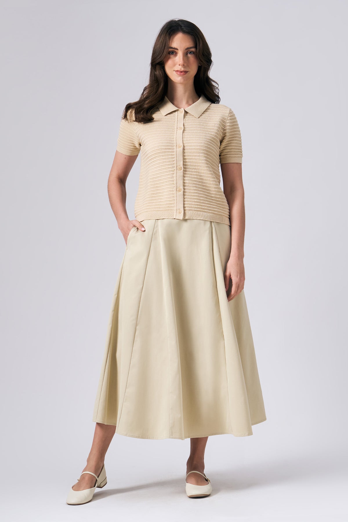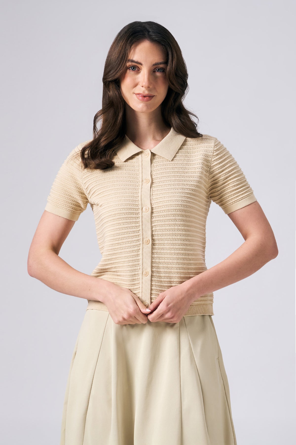 - Design Details: Full Placket, Tonal Buttons
