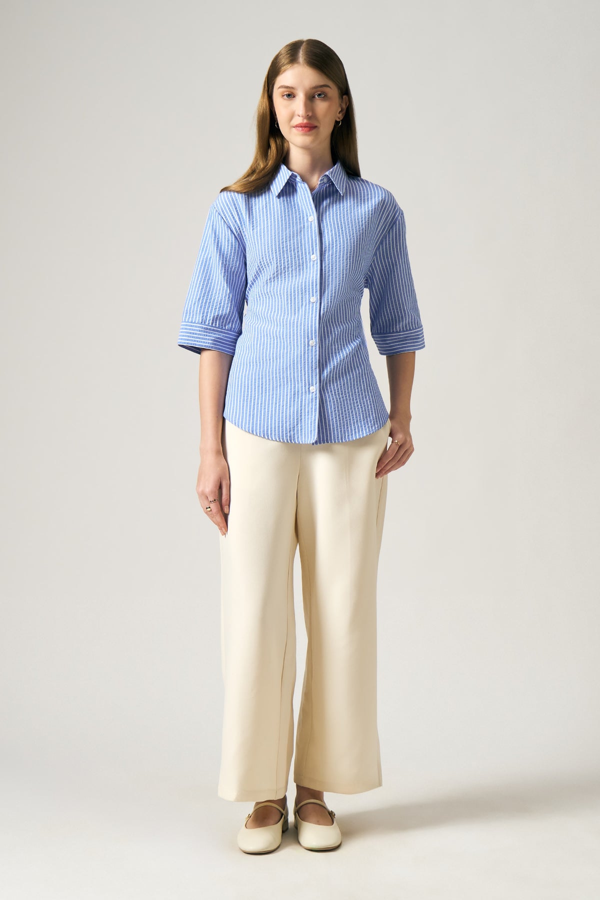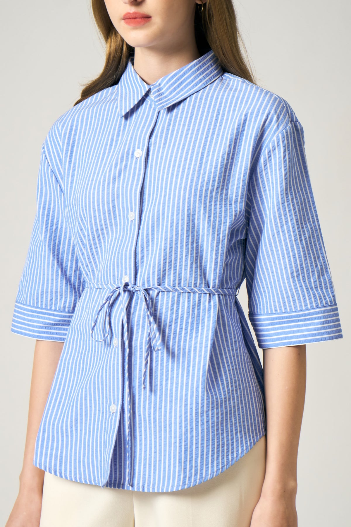 Design Details: Striped Seer Sucker Fabric, Self fabric waist string, Sleeve cuff, Full Button Down