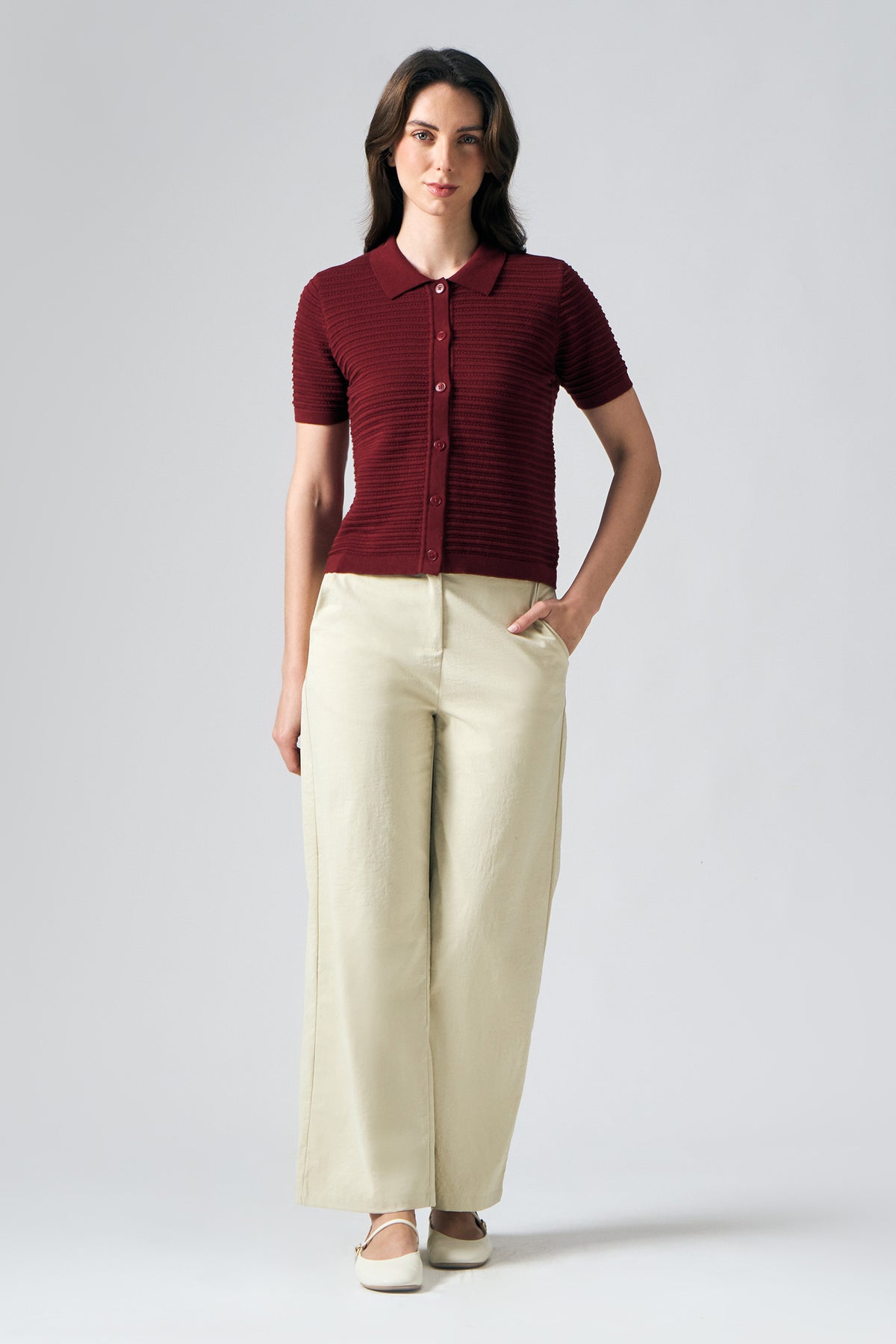 - Design Details: Full Placket, Tonal Buttons