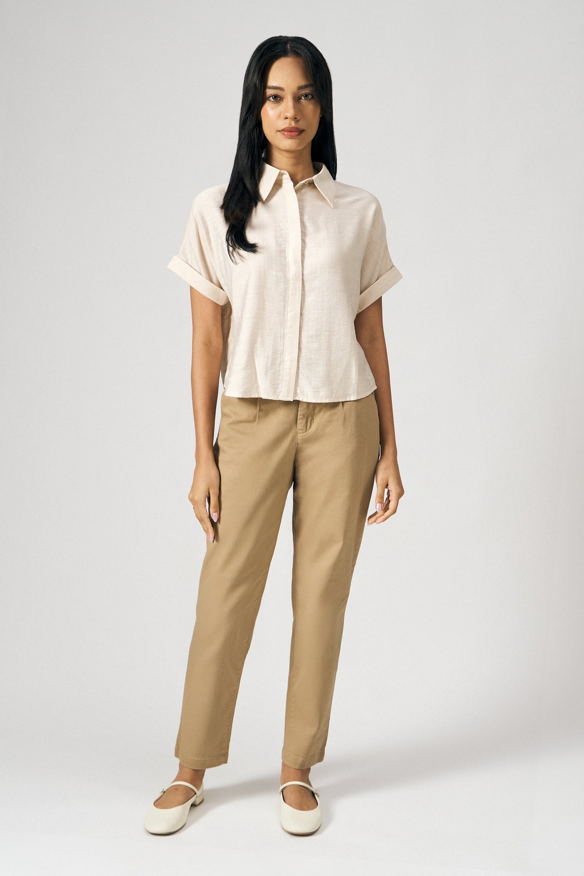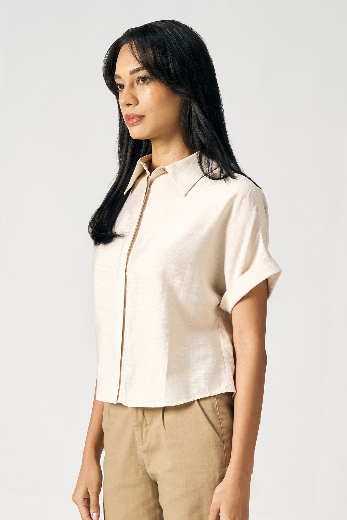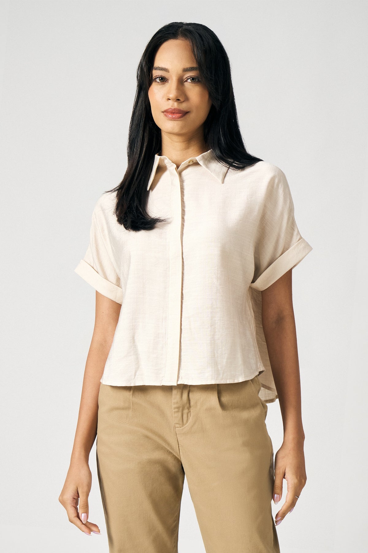 • Design Details: Hidden Full Button Down Placket, Back Yoke With Inverted Box Pleat Amboy Hem, Faux Sleeve Cuff
