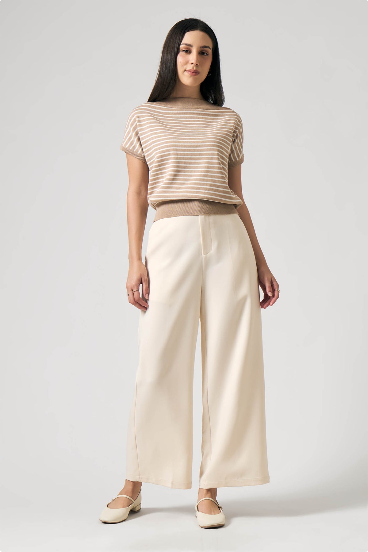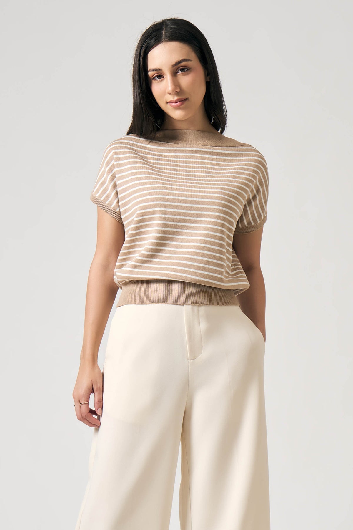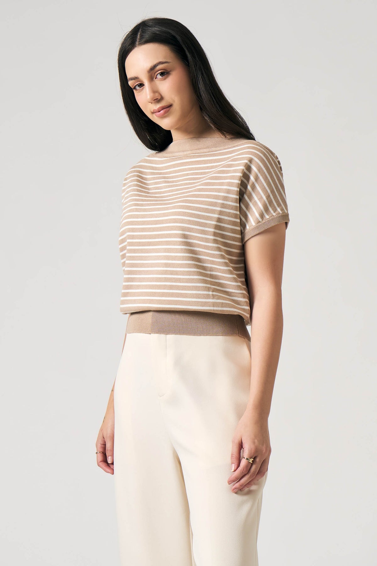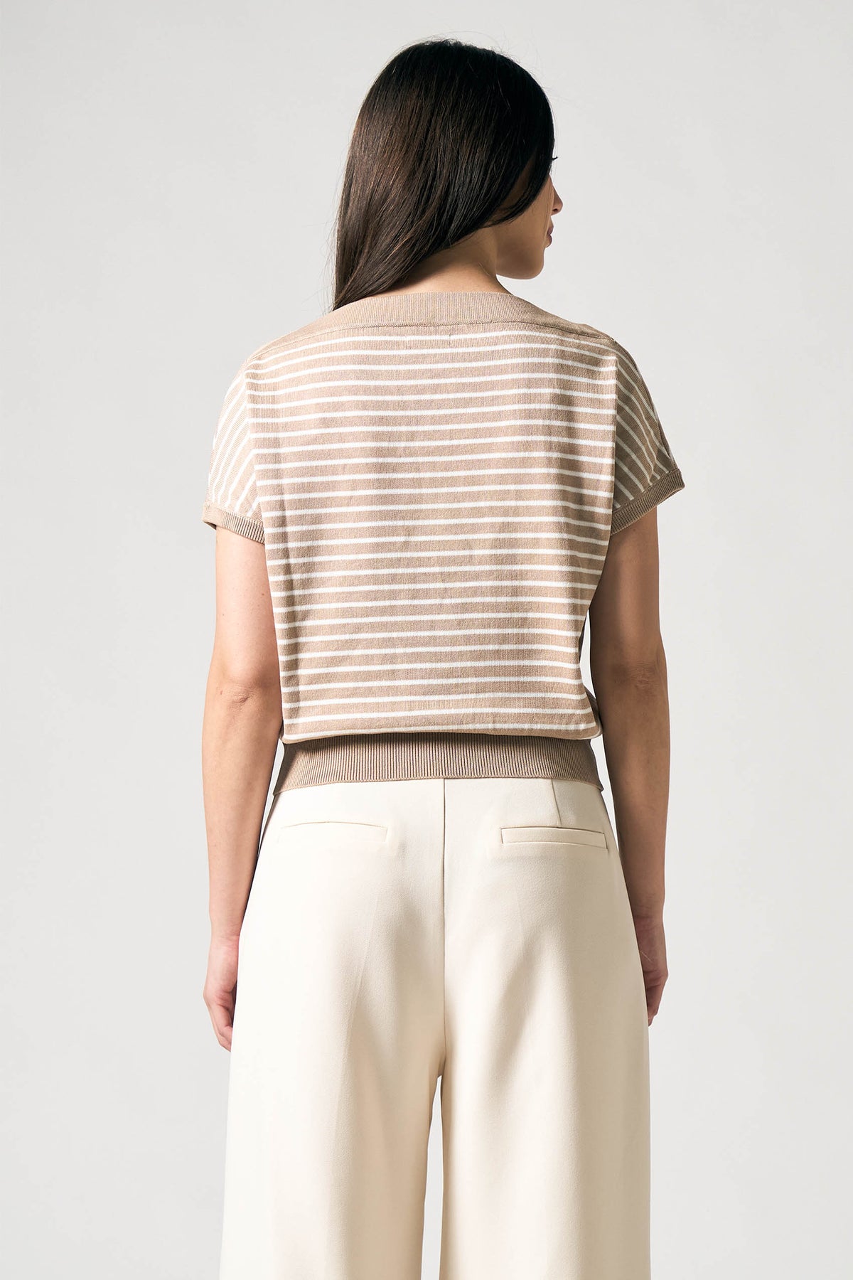 • Design Details: Striped Flat Knit Fabric, Extended Sleeve, Sleeve Cuff, Hem Band, Slashed Neck