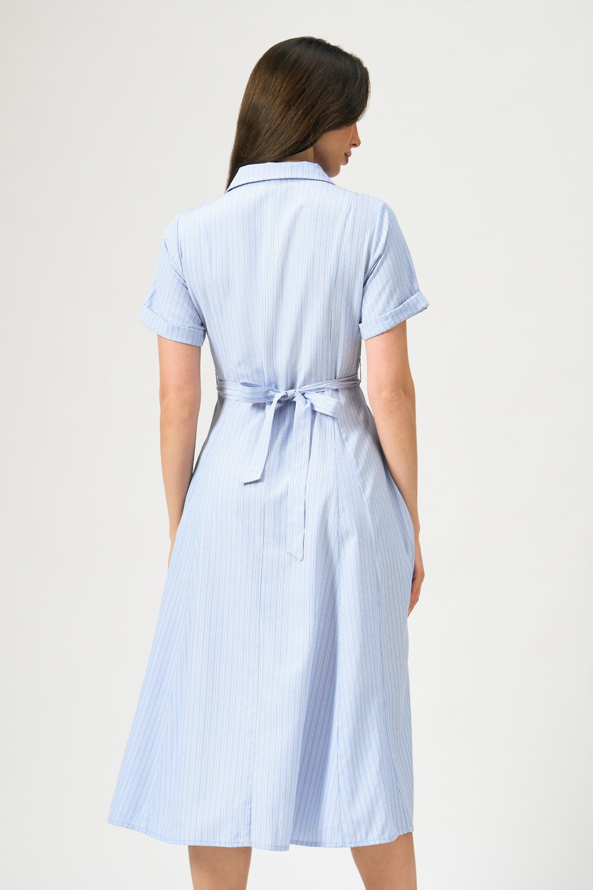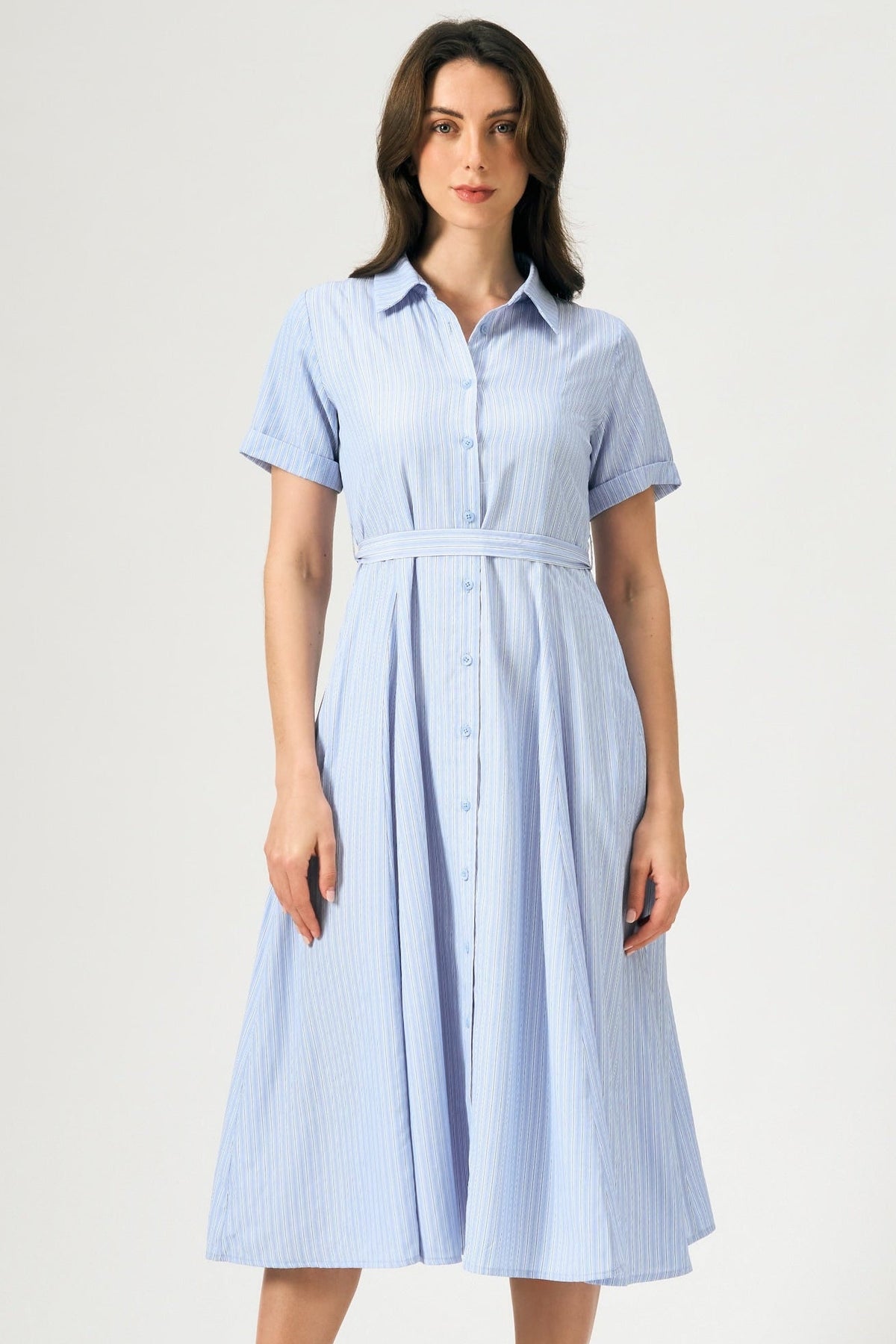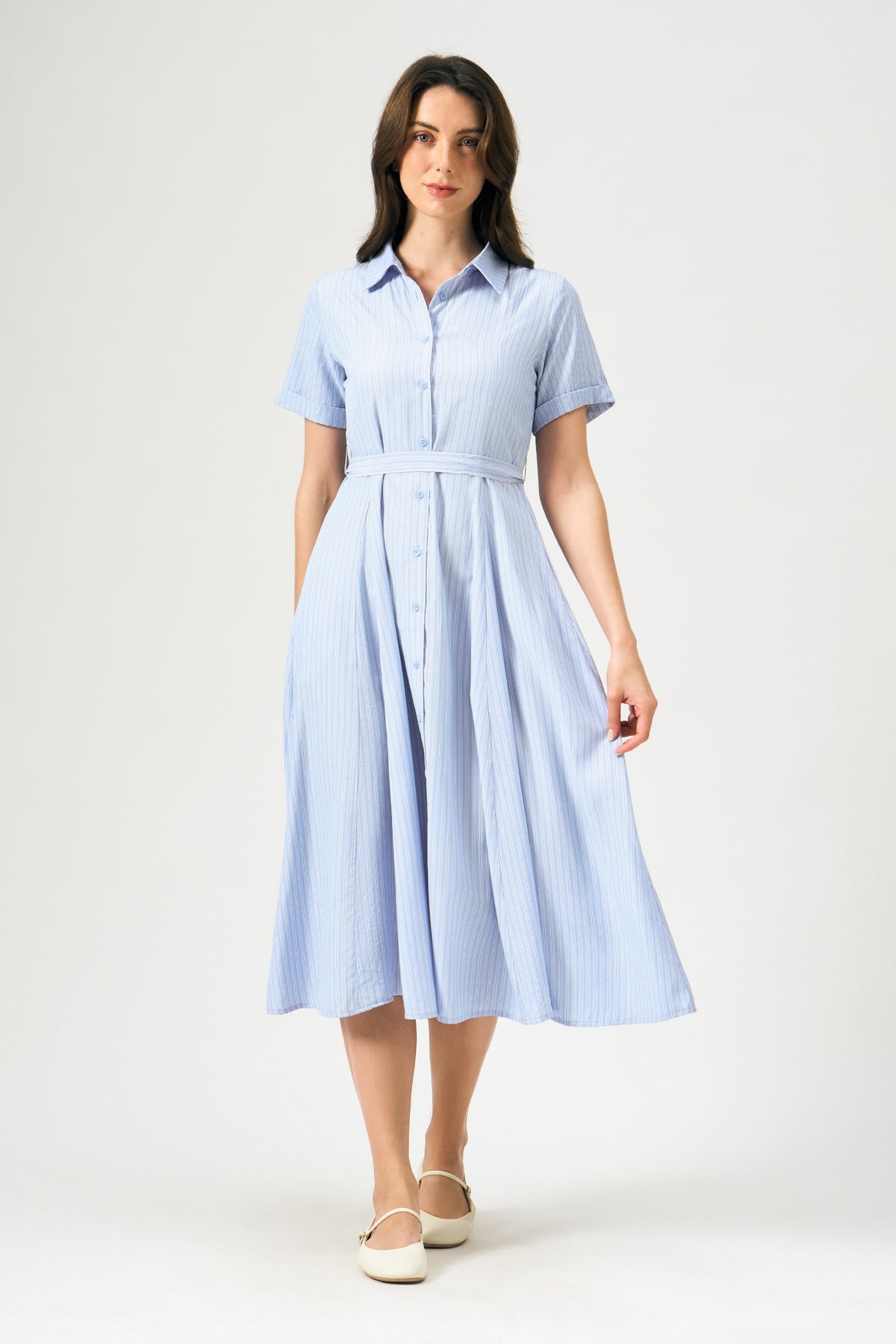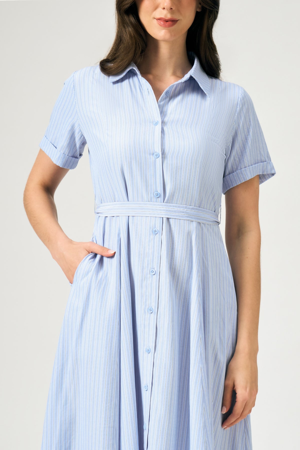 - Design Details: Striped Woven Fabric, Cut And Sew Panels, Princess Cut Darts, Faux Sleeve Cuff, Self Fab Waistband, Full Button Down